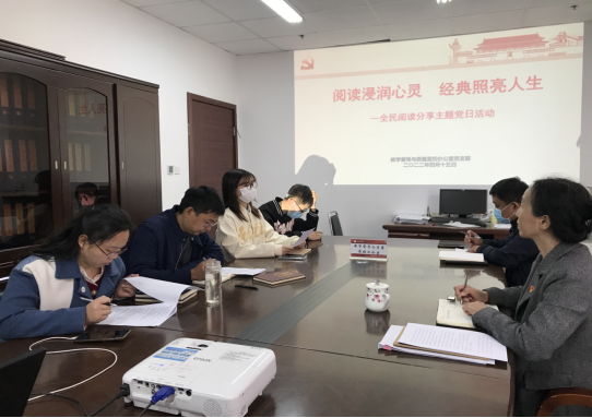 2022年4月15日上午十点,教学督导与质量监控办公室党支部组织全体人员及“红烛”导师结对子学生在图书馆南楼619办公室开展了“全民阅读”主题党日活动。活动由党支部书记赵荷花主持。