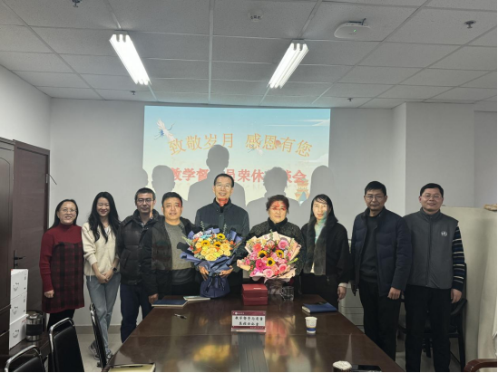 最后,赵荷花及教师代表向两位荣休老师献花和赠送纪念品,全体参会人员合影留念。以此仪式表达对荣休教师们多年辛勤付出的肯定和对他们未来生活的美好祝愿。
